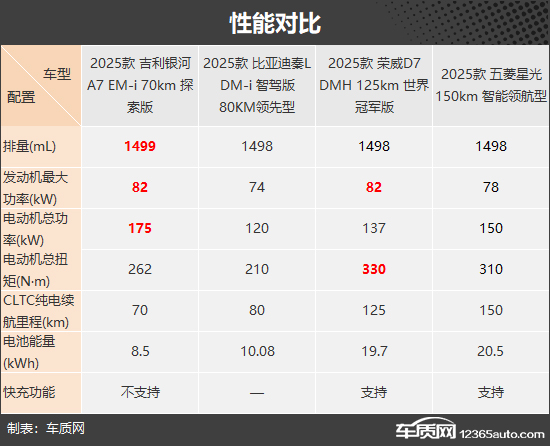 可以看到,这四款自主厂商打造的10万级插电混动中型车已展现出不俗的产品实力,且差异化的定位也令它们的受众稍有不同。吉利银河A7整体表现优异,几乎在每个方面都展现出不错的水准,可谓“全面型选手”。比亚迪秦L DM-i在舒适与便利性配置上相对薄弱,其余方面表现较为均衡。荣威D7 DMH凭借上汽深厚的造车功底,在动力性能上拥有一定优势。而五菱星光则将重点放在了更为实用的配置上,凸显出更高性价比。总体来看,四款车型各有所长,消费者可根据自身需求,做出最适合的选择。
