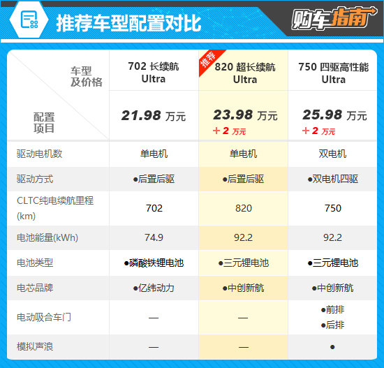 指导价为23.98万元的820超长续航Ultra是本次的推荐车型,通过配置对比可以看出,推荐车型相比入门版车型,电池换装为三元锂电池,电池能量也提升至92.2kWh,使其纯电续航里程达到了820km,彻底告别里程焦虑。售价只比入门版车型增加2万元,绝对物有所值。