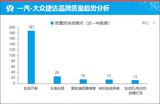 通过筛选一汽-大众捷达品牌旗下车型近一年的投诉数据可以发现,“轮胎开裂”的投诉相对较多,投诉主要集中在捷达VS5和捷达VS7车型上。由于一汽-大众捷达VS8使用了规格更高的赛轮轮胎,而问题车型多配备的是玲珑轮胎,因此可暂且认为其出现上述故障问题的概率较低。但实际情况如何,还要待其上市使用一段时间后才能有定论。