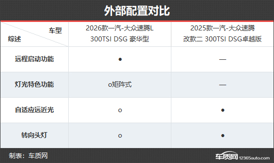 外部配置方面,2026款速腾L新增加了远程启动功能,并且提供IQ.Light矩阵式大灯的选装,科技感更强。不过,自适应远近光和转向头灯功能均由老款的标配变为了选装,这一点颇感遗憾。