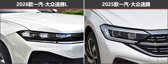 外观方面,2026款速腾L换装了最新的家族式设计语言,尤其是贯穿式的前脸,有效拉宽车头的视觉宽度,再辅以犀利的线条设计,让整车看上去更加年轻、时尚。此外,前包围处还增添了一条镀铬装饰条,加强精致感。对比而言,2025款速腾重点突出沉稳、经典的风格。