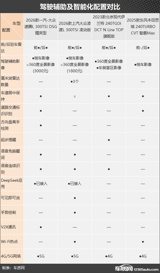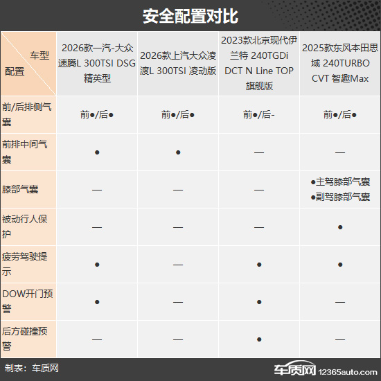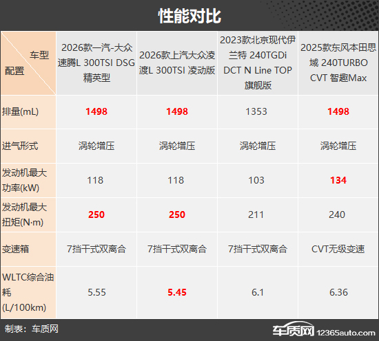 本次挑选的四款车型分别为2026款一汽-大众速腾L 300TSI DSG 精英型(以下称:大众速腾L)、2026款上汽大众凌渡L 300TSI 凌动版(以下称:大众凌渡L)、2023款北京现代伊兰特 240TGDi DCT N Line TOP旗舰版(以下称:现代伊兰特)和2025款东风本田思域 240TURBO CVT 智趣Max(以下称:本田思域)。四款车型产品特点和市场定位基本相同,且终端售价也比较接近(由于目前图片数量较少,因此部分车型的图片并不是相对应的具体款型)。