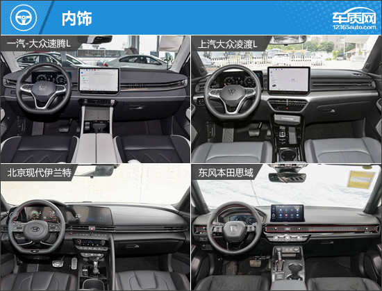 内饰方面,或许是因为定位比较接近,四款车型的设计风格也较为相似,都是在保持传统布局的同时,加入了更多科技化元素,以满足目标客户的需求。其中,大众速腾L、大众凌渡L和本田思域采用悬浮式中控屏,现代伊兰特则是由10.25英寸高清液晶仪表盘和触控车机组成双联屏,科技感更强。换挡形式方面,本田思域和现代伊兰特采用机械挡把换挡,样式更传统;大众凌渡L和大众速腾L分别采用电子挡把换挡和旋转式电子怀挡,更具精致感。