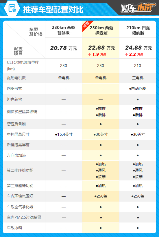 售价为22.68万元的230km两驱探索版是本次的推荐车型。通过配置对比可以看出,推荐车型相比低一版车型,增加了感应后备厢、方向盘加热、第二排座椅加热/通风/按摩、车载冰箱等实用功能,用车体验得到显著提升。并且还配备了30英寸一体式双联屏以及后排液晶屏幕,更贴合当下消费者的用车需求。售价仅比低一版车型多19000元,绝对物有所值,性价比出色。
