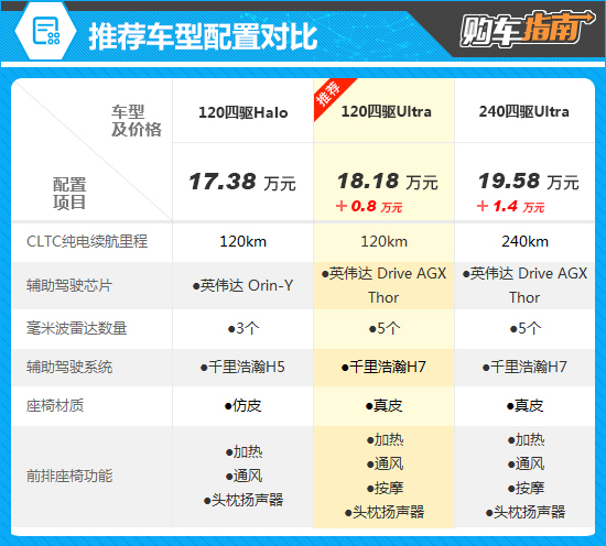 通过对比配置不难发现,推荐车型相比入门版,辅助驾驶芯片、毫米波雷达数量、辅助驾驶系统、座椅材质和前排座椅功能等方面均有提升。尤其是千里浩瀚H7辅助驾驶系统+英伟达Thor芯片的组合,能够提供更加智能化的用车体验,结合两者差价仅8000元,建议升级。