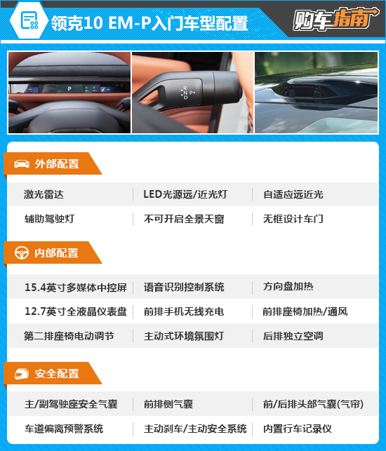 领克10 EM-P的入门车型的配置表现并不寒酸,在便利性、舒适性以及安全性方面都能令人满意,比如可调软硬的可变悬架功能、前排座椅加热/通风、第二排座椅电调、主动式环绕氛围灯以及23扬声器音响系统等,均有配备。而此次不推荐的原因,主要在于还有性价比更高的车型。