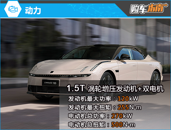 领克10 EM-P搭载由1.5T发动机与P1+P3+P4三电机组成的智能电混系统,发动机最大功率120kW,最大扭矩255N·m;电动机总功率270kW,总扭矩500N·m,匹配3挡DHT变速箱。电池组分为18.4kWh与38.2kWh两种,对应的CLTC纯电续航里程分别为120km与240km。