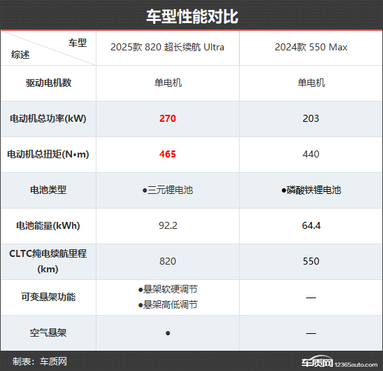 动力系统方面,新款车型基于全域800V高压SiC平台打造,提供单电机和双电机两种版本,其中,单电机版电动机总功率提升至270kW,电动机总扭矩达到465N·m。此外,电池类型更换为三元锂电池,能量达到了92.2kWh,CLTC纯电续航里程为820km,比老款车型增加了270km,彻底告别里程焦虑。值得一提的是,新款车型全系标配空气悬架,支持悬架软硬/高低调节,无论是车身姿态还是乘坐舒适性均得到较大的提升,值得点赞。