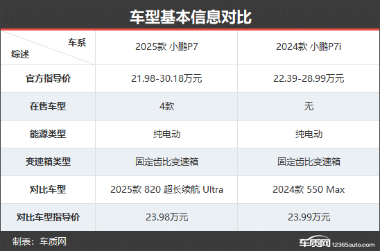 全新小鹏P7共推出4款车型,比老款车型增加了一款,消费者选择余地更大。售价方面,新款车型的起售价有所降低,但顶配车型的售价超过了30万元。本次对比选择了两款售价相近的车型,以便能够更加直观地看出新老款车型在配置层面的具体差异。