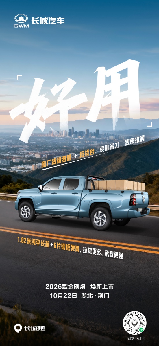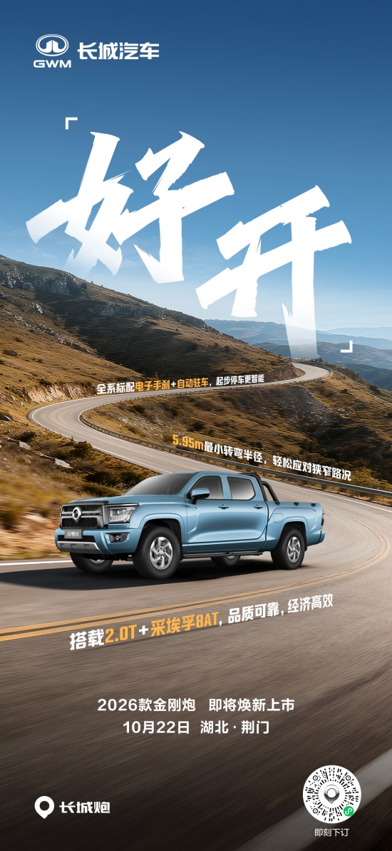 目前,我们从长城汽车官方获悉,2026款金刚炮将于10月22日在湖北荆门正式上市。新车将搭载2.0T+8AT动力总成,全系标配电子手刹+自动驻车,最小转弯半径5.95米。