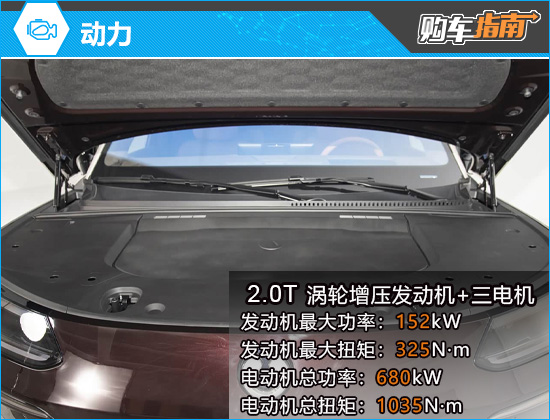 动力方面,新车依旧沿用插电混动形式,搭载2.0T涡轮增压发动机,最大功率152kW,最大扭矩325N·m,并配合三电机驱动,电机总功率达680kW,电机总扭矩1035N·m。CLTC纯电续航里程为202km/230km(长续航模式),CLTC综合续航里程1302km/1330km(长续航模式),NEDC工况下馈电油耗仅6.3L/100km。同时,其还配备易三方技术,可实现极致转向、圆规掉头、智能泊车、低附路面增稳、高速爆胎控制及蟹行模式等功能。