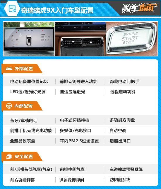 2026款奇瑞瑞虎9X的入门车型为豪华版,虽然是入门车型,但配置层面表现令人满意,像电动后备厢位置记忆、自适应远近光、自动空调等使用频率较高的配置均有配备。同时其还拥有车道居中保持、全速自适应巡航、前排中间气囊等配置的加持。综合考虑价格、配置、性能等多方面因素,豪华版是本次最为推荐购买的车型。
