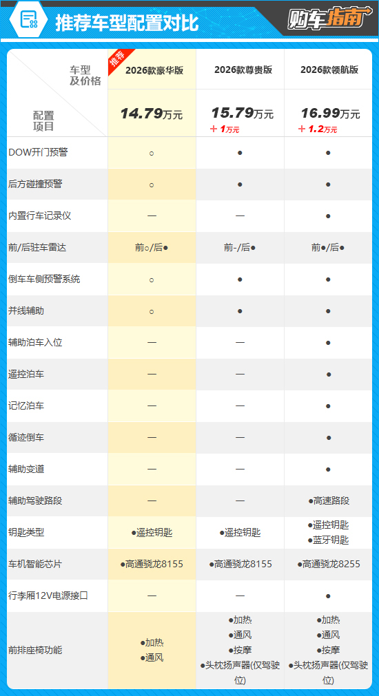 目前在售的3款车型中,更推荐豪华版。高一级别车型相比推荐车型, 配置上的提升主要集中在舒适性、主动安全和驾驶功能方面,如后方碰撞预警、并线辅助、前排座椅按摩功能等。虽然配置水平有一定提升,但结合需要增加1万元的预算来综合考虑,性价比不高。而且,其中的部分配置,推荐车型都拥有选装机会,可按需灵活选择。