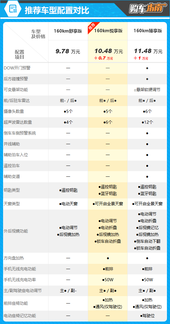 通过配置对比来看,160km悦享版更值得推荐,售价相比入门车型贵了0.7万元,配置方面增加了前驻车雷达、外后视镜电动折叠、前排手机无线充电、方向盘加热、前排座椅加热等多项实用功能,以相对较低的成本实现了用车体验大幅提升,可谓物超所值。