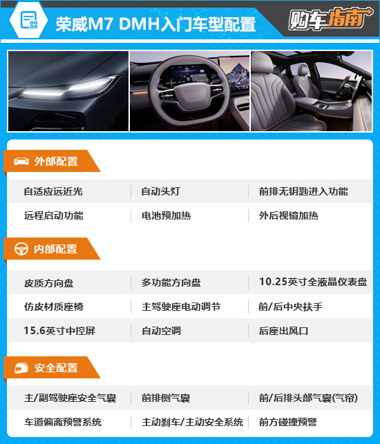 作为荣威M7 DMH全系的入门车型,160km舒享版售价不足10万元,却依然提供了较为丰富的主被动安全配置以及完善的车机功能,并且搭载了L2级辅助驾驶系统,可实现全速自适应巡航、车道居中保持等,基本可以满足日常驾驶需求。不过,由于入门车型在驻车雷达、天窗、外后视镜、车内充电、座椅等方面存在功能缺失,导致用车体验略打折扣,因此不做重点推荐。