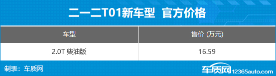 10月15日,212正式发布了T01柴油版本的正式售价,售价为16.59万元。购车可享六重礼,包括焕新礼、金融礼、桃园礼、感恩礼、保障礼和智联礼。