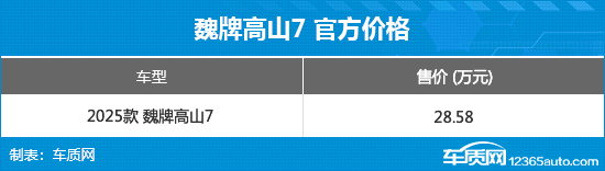 10月15日,魏牌高山7在保定正式上市,新车共推出1款车型,官方售价为28.58万元。同时,官方还推出现金膨胀礼、购车无忧礼、保养无忧礼等上市权益。