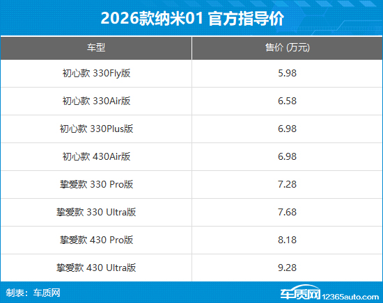 动力方面,2026款纳米01搭载前置单电机,电动机总功率70kW,总扭矩160N·m。电池方面,新车提供31.45kWh和42.3kWh的磷酸铁锂电池组,对应的CLTC纯电续航里程分别为330km和430km。