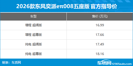 2026款东风奕派eπ008五座版正式上市,共推出4款车型,售价区间16.99-18.16万元,限时焕新售价区间15.99-17.16万元。新车主要针对外观配色和部分配置进行调整,依旧提供增程和纯电两种动力。