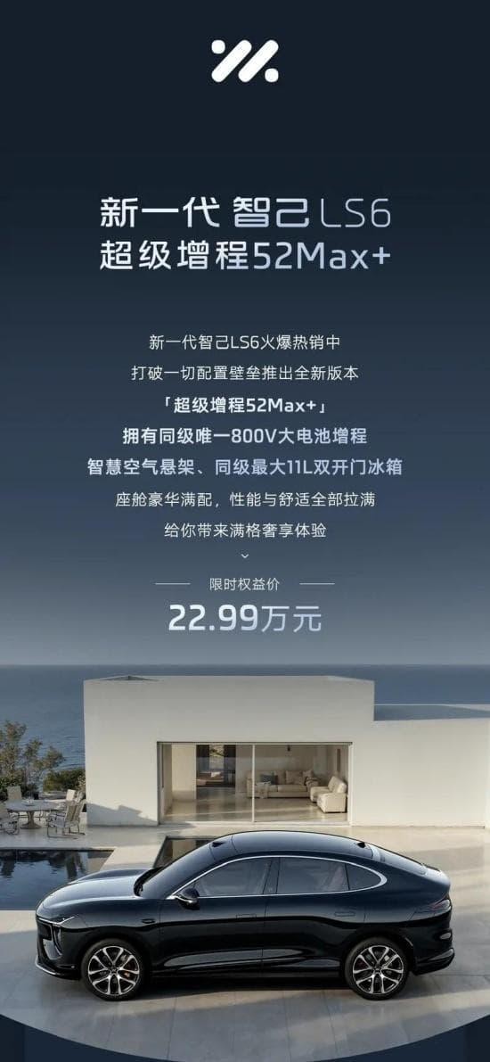 10月16日,智己LS6增程52 Max+车型正式上市,官方指导价为24.49万元,限时权益价22.99万元。同时官方表示,即日起至10月31日,下定新一代智己LS6可享至高价值95600元的购车礼遇。