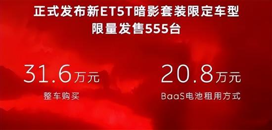 10月17日,蔚来ET5T暗影套装限定车型正式上市,共推出1款配置,整车售价31.6万元,BaaS电池租用方式售价20.8万元,限量发售555台。新车基于《创:战神》电影为设计灵感打造,车身印有赛博光影拉花,视觉效果个性前卫。2025年10月31日(含)前锁单的用户,可免费选装交流充放电套装(或置换价值4000元的选装基金),并可享5年NOP+免费使用权以及获赠价值9500元的适享套装。