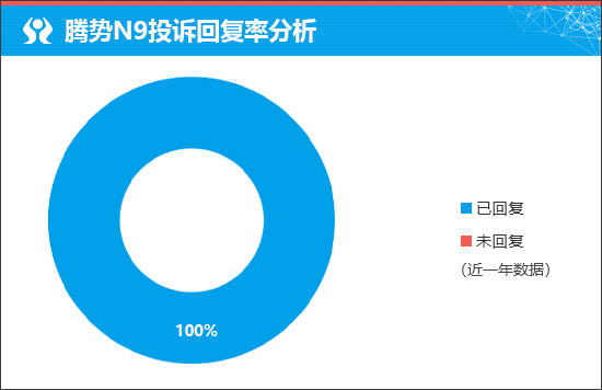 在衡量新车售后服务口碑方面,我们将通过企业对于车主投诉的回复情况进行分析,相对客观地对于新车未来的售后服务口碑有所预判。据车质网数据显示,近一年腾势N9车型的投诉回复率为100%,可见厂家对于车主的诉求十分重视,对于已出现的问题解决态度非常积极。