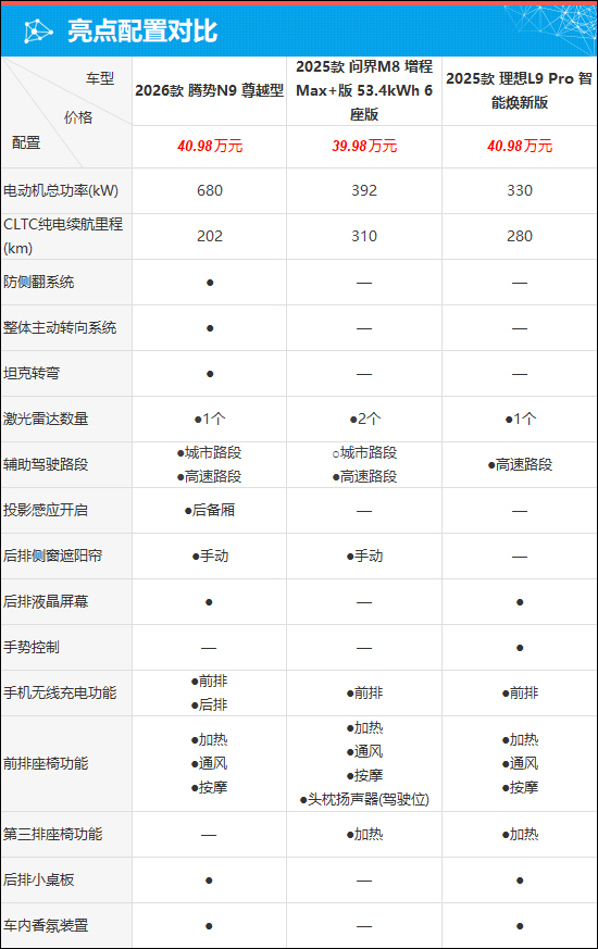 配置方面,作为全新改款车型,2026款腾势N9在多项表现上实现大幅领先,尤其在驾驶层面尤为突出。凭借三电机系统的优势,其拥有最强动力性能,并在易三方技术平台的加持下可完成多种复杂行驶功能,领先同级竞品。同时,它也是唯一标配城市及高速路段辅助驾驶的车型。相比之下,2025款问界M8(增程版)的优势主要体现在座椅功能上,可为驾乘人员带来更出色的舒适体验;2025款理想L9则是唯一具备手势控制的车型,亮点虽不多,但整体表现较为均衡。