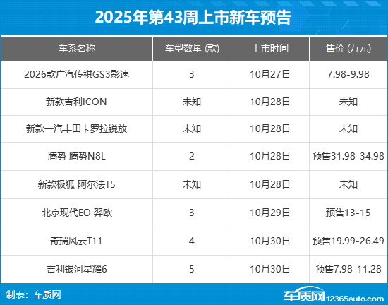 2025年第43周(10月27日-11月3日)上市新车预告