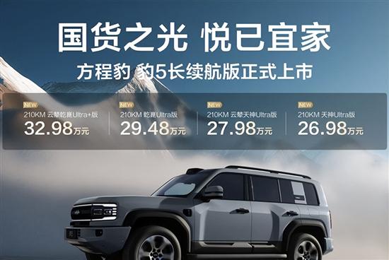 10月20日,方程豹豹5长续航版正式上市,新车共推出4款车型,官方指导价区间为26.98-32.98万元。同时,官方还推出智享金融礼、智享置换礼、智享智驾礼等上市权益。
