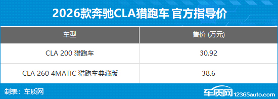 日前,车质网从梅赛德斯-奔驰官方获悉,2026款奔驰CLA猎跑车正式上市,共推出2款车型,售价区间30.92-38.6万元。作为年度改款车型,新车主要针对车型配置进行调整,将现款CLA 260 4MATIC 猎跑车升级为CLA 260 4MATIC 猎跑车典藏版,并且价格有所下调,外观和内饰设计则保持不变。