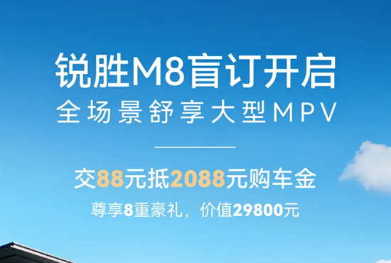 近日,车质网从相关渠道获悉,北京汽车制造厂正式开启了旗下锐胜M8车型的盲订,盲订权益为88元订金抵扣2088元购车款。