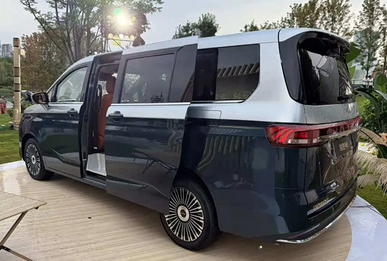 车身侧面多以平直的线条修饰,侧滑式开启的车门让乘客上下车更加便捷也更具仪式感。同时,车身提供了双色涂装,搭配多辐条轮毂,烘托出几分典雅氛围。尺寸方面,新车轴距达到3200mm。