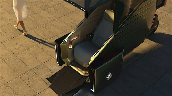 座舱通过电动铰链向上开启,内饰以玫瑰金和白色皮革为主色调,搭配圆形仪表盘和触控式操作面板,宛如艺术品。