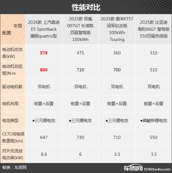 性能方面,四款车型均搭载前置+后置双电机。其中,上汽奥迪E5 Sportback在电动机总功率与总扭矩方面表现出色,超过了其余三款车型。此外,CLTC纯电续航里程方面则是极氪007GT领先,为730km。