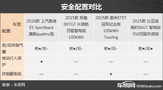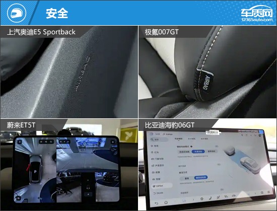 四款车型都有着较为全面的主/被动安全配置,对于车内乘客能够提供全方位的安全防护。其中,上汽奥迪E5 Sportback、蔚来ET5T和比亚迪海豹06GT分别独享被动行人保护、防侧翻系统和后排侧气囊。相比之下,极氪007GT的表现略逊一筹。