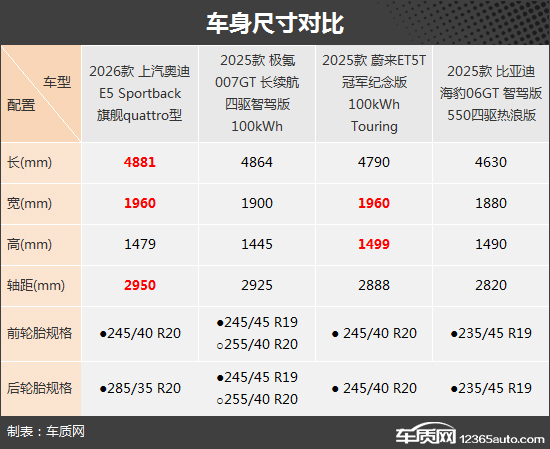 车身尺寸方面,上汽奥迪E5 Sportback表现亮眼,不仅车身宽度与蔚来ET5T一致,携手领先,车身长度和轴距也是四款车型中最长的,分别达到了4881mm和2950mm。而车身高度则是蔚来ET5T更胜一筹。