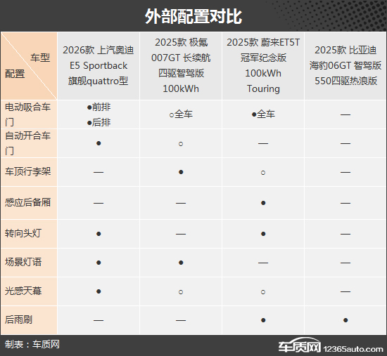 在外部配置方面,上汽奥迪E5 Sportback更为丰富,配备的自动开合车门和感光天幕是其他三款车型并未标配的。极氪007GT提供了车顶行李架,不仅提升了扩展能力,还能够彰显出独特的跨界风格。相比之下,比亚迪海豹06GT的外部配置表现略显不足,但提供了后雨刷值得好评。