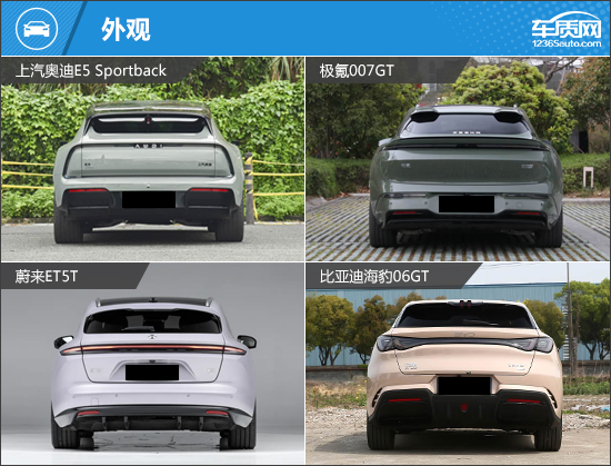 外观方面,上汽奥迪E5 Sportback作为上汽AUDI品牌首款车型,采用全新设计语言,与以往奥迪车型形成鲜明对比,并取消了经典的四环标识,换用“AUDI”字母标识,更具辨识度。极氪007GT搭载贯穿式灯幕,支持多种个性化光效,科技感十足;蔚来ET5T与比亚迪海豹06GT则延续各自的家族式设计,风格稳健但亮点稍显不足。
