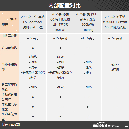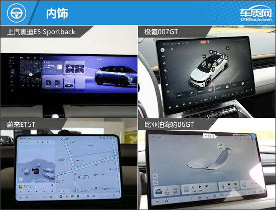 内部配置方面,上汽奥迪E5 Sportback和极氪007GT均为前后排乘客提供了充足的座椅功能,大幅提升了舒适性。相比之下,虽然蔚来ET5T的价格大幅高于比亚迪海豹06GT,但它的前排座椅通风功能需要选装才可以获得,略显不够厚道。综合来看,上汽奥迪E5 Sportback配置表现更为全面,而蔚来ET5T和比亚迪海豹06GT则略逊一筹。