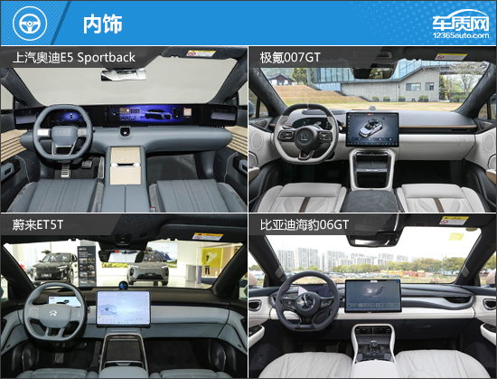 内饰方面,四款车型的设计都比较简约,减少了物理按键数量并取消传统空调控制面板,使其看上去干净利落。同时,除了上汽奥迪E5 Sportback采用贯穿式屏幕之外,其余三款车型的中控屏均为中置悬浮式设计。细节方面,上汽奥迪E5 Sportback仪表台和车门饰板有着强烈的对比,强调不同材质营造出的质感;比亚迪海豹06GT则延续了海洋网家族式设计,大量曲线线条的加入呼应了海洋主题。