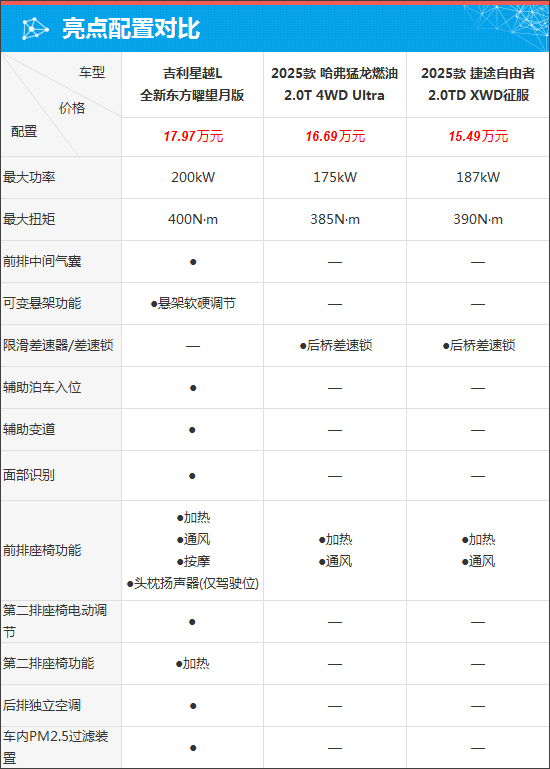 具体到车辆配置层面,通过对比来看,哈弗猛龙燃油版与捷途自由者均配备后桥差速锁,而定位城市SUV的星越L虽未搭载该配置,却独享支持软硬调节的可变悬架、辅助泊车入位、辅助变道、前排座椅按摩、第二排座椅加热及后排独立空调等多项功能,并且其动力参数在三车中也处于领先水平,整体表现更为出色。