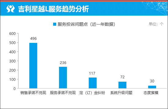 从服务投诉问题点来看,主要集中在“销售承诺不兑现”、“服务承诺不兑现”以及“定(订)金纠纷”方面。综合来看,吉利星越L的整体服务表现一般,亟需加强。