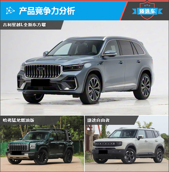 此次与吉利星越L全新东方曜(下文简称星越L)对比的车型分别为哈弗猛龙燃油版和捷途自由者。三款车型中,哈弗猛龙燃油版在车身长度方面有优势,捷途自由者则是车身宽度和车身高度领先,而星越L在轴距上更胜一筹。
