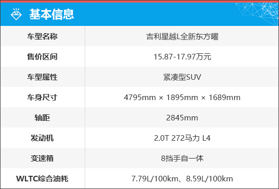 吉利星越L全新东方曜共推出3款车型,售价区间为15.87-17.97万元。新车全系标配2.0T涡轮增压发动机+8速手自一体变速箱的动力组合,并新增月牙青、莫高蓝、丹青三款专属车色。
