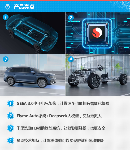Flyme Auto系统基于Alive Design设计理念打造,内置高通骁龙8155芯片,支持四屏联动、全面屏手势、一语即达等功能。深度融合Deepseek大模型的AI语音系统,更是一位懂你的出行伙伴,重新定义燃油智能座舱新高度。