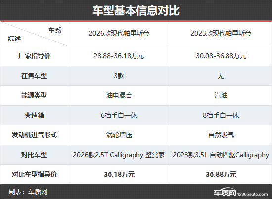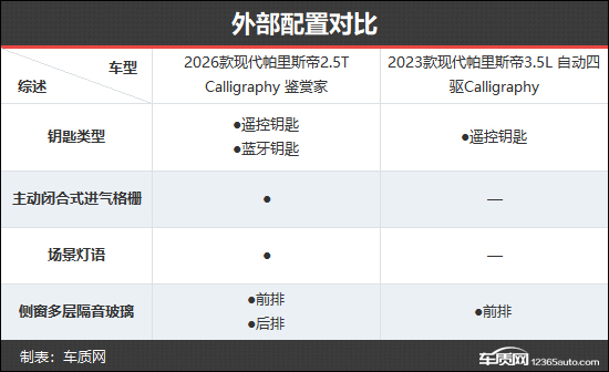 2026款现代帕里斯帝共推出3款车型,车型数量与2023款相比进行了精简。本次对比选择了新老款车型的Calligraphy版本,以便能够更加直观地看出两者在配置层面的具体差异。