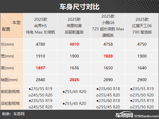 尺寸方面,除了红旗天工06,其余三款车型的长宽高均至少有一项领先于其他竞争对手。值得一提的是,红旗天工06的轴距为2900mm,而岚图知音更是达到了2925mm,具备跨级与中大型SUV一较高下的资本。