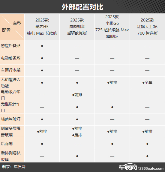 外部配置环节,尚界H5和岚图知音的整体表现相对更好一些。其中,前者搭载感应后备厢和电动前备厢,实用性可圈可点;后者独享前排电动吸合车门以及后排侧窗多层隔音玻璃,营造出很强的豪华感。红旗天工06中规中矩,比较亮眼是后排侧隐私玻璃。值得一提的是,岚图知音和小鹏G6均采用无框设计车门,对于年轻消费者更具吸引力。