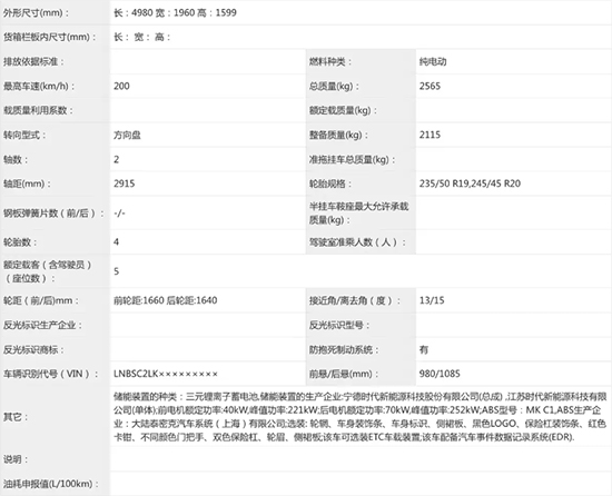 根据申报信息来看,新车将提供丰富的选装内容,包括不同样式的轮毂、车身饰条、特殊标识以及双侧保险杠等。尺寸方面,其长宽高分别为4980mm*1960mm*1599mm,轴距2915mm。