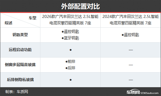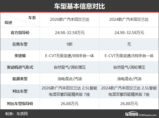 2026款广汽丰田汉兰达共推出9款车型,车型数量与2024款相比进行了精简。本次对比选择了新老款车型的2.5L智能电混双擎四驱精英版 7座,从市场反馈情况来看,中低配车型对整体销量走势影响较大,选择上述车型进行对比,能够更直观地看出新老款车型在综合竞争力方面的差异。